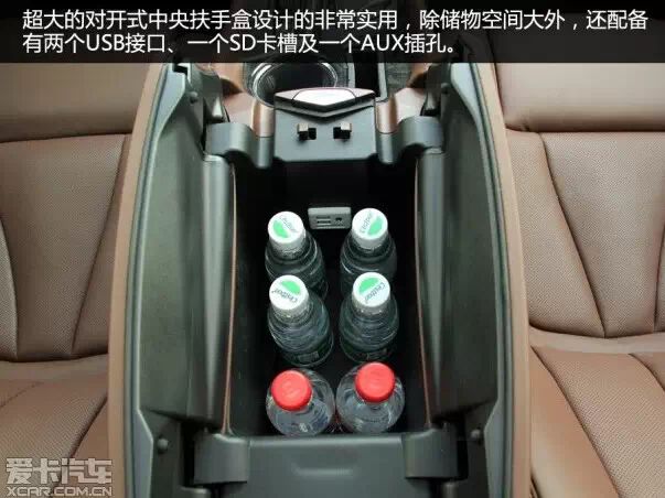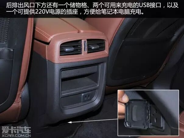 丰富的储物槽让各种大大小小的物品有了容身之处,只是车门上的第二层储物槽以及手套箱空间显得有些局促。超大的对开式中央扶手盒设计的非常实用,除储物空间大外,还配备有两个USB接口、一个SD卡槽及一个AUX插孔,方便娱乐系统音源的扩展。后排出风口下方还有一个储物格、两个可用来充电的USB接口,以及一个可提供交流电源的插头,方便给笔记本电脑充电。