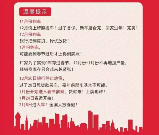 温馨提示时光荏苒,一眨眼间就接近年末了,春节的步伐已向我们逼近,有多少人因为错过了春节前最佳购车时机而面临着这样那样的问题,错过了最实惠的价格,选不到最喜欢的现车,买了新车却来不及上牌,人生最痛苦的事情莫过于此。。。。。。