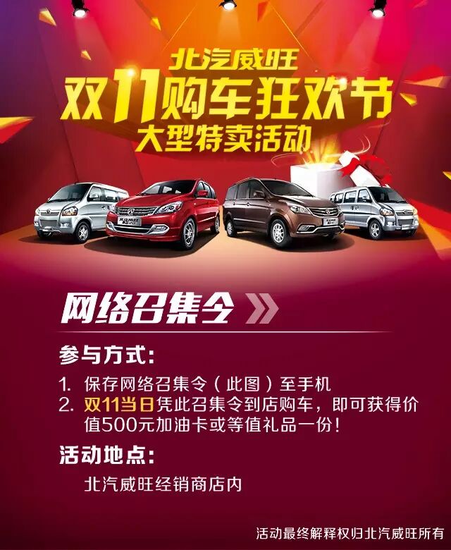 威旺店头双11疯狂让利,约你一起来狂欢!保存下图“网络召集令”,双十一到店购车即可获得500元加油卡或等价礼品一份。