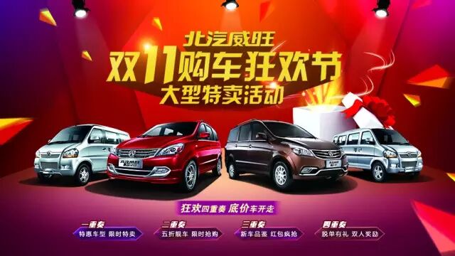 一年一度的“双11”购物狂欢节马上就要到了,众多“剁手族”已开始摩拳擦掌,准备疯狂一番。你还在守着电脑等着凌晨秒杀抢购吗?现在来北汽威旺,超值优惠不用抢,四重大礼到店即享,全国经销商联合举办“双11购车狂欢节”,陪你High翻“双11”,不仅可以5折购靓车,更有各种红包豪礼拿不停!
