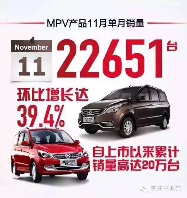 2015年,国内汽车市场消费需求的放缓让不少汽车厂商感受到了丝丝凉意。面对严峻的市场环境,北汽威旺通过不断扩充产品阵容、深入一线市场销售、完善品牌营销、跟进售后与服务等一系列举措,实现11月销量25388台,环比增长42.5%,其中MPV产品单月销量22651台,再创历史单月销量新高,为低迷的车市注入了一针强心剂。在党委书记、总经理陈桂祥,党委委员、副总经理、销售公司总经理张朝翔的带领下,威旺人用一腔热血,为信念坚持不懈,用实力缔造了“威旺速度”的销售奇迹!